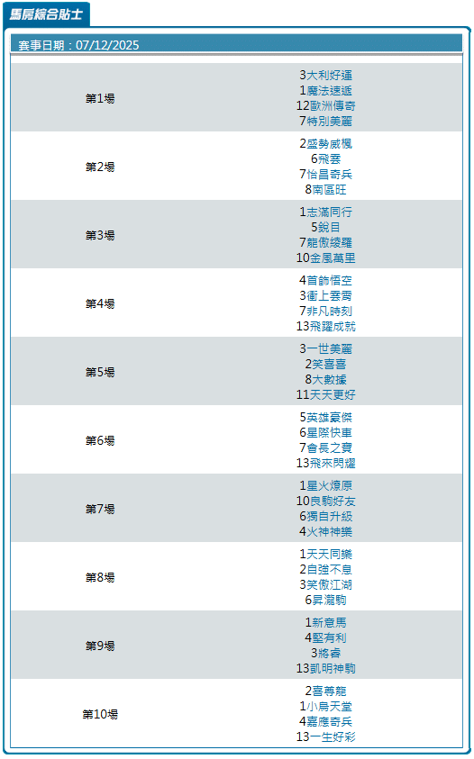 後段賽事貼士方面再次回歸穩陣路線,以班底成熟、同程發揮穩定為原則,集中火力放在具長期實績支撐的馬匹身上,務求守穩過關率。